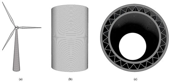 The 3D printing of concrete, also known as the additive manufacturing of concrete, involves depositing layers of concrete material in a precise and controlled manner to build up a 3D structure. This process is typically achieved using a large-scale 3D printer that can accommodate the size and weight of the printed object. In the case of wind turbine towers, 3D printing offers several advantages over traditional methods. For example, a 3D-printed foundation can be designed with greater precision and optimization, accounting for factors such as soil conditions, wind loads, and seismic activity. This control can result in a more efficient use of materials and reduced construction time. Recently, the feasibility of 3D printing concrete in wind turbine tower construction has been evaluated []. It was reported that fabricating a wind turbine tower with 3D-printed concrete reduced CO2 emissions by 23% compared to a steel tower. Moreover, 3D printing can reduce the need for the manual labor and equipment typically needed for traditional concrete construction, as the printing process can be largely automated. In addition, it has been indicated that logistical complexity and expense are significant when moving large tower components to their designated installation locations. To address this problem, GE Renewable Energy, Cobod, and Lafarge Holcim cooperated to print the first wind turbines with optimized 3D-printed concrete bases in the world [], as shown in Figure 1. The 3D-printed concrete bases, with heights up to 200 m, were expected to optimize construction costs and reduce execution times. Wind turbine towers have conventionally been constructed using steel or precast concrete, with a usual height constraint of less than 100 m. This limitation arises from the necessity to keep the base width within a diameter of 4.5 m, a size transportable by road without incurring substantial extra expenses. To better understand the real application of 3D-printed wind turbine towers in the industrial world, it is necessary to investigate their structural behaviors, such as under static loads, seismic loads, and blast loads. However, few of these investigations have been carried out.
