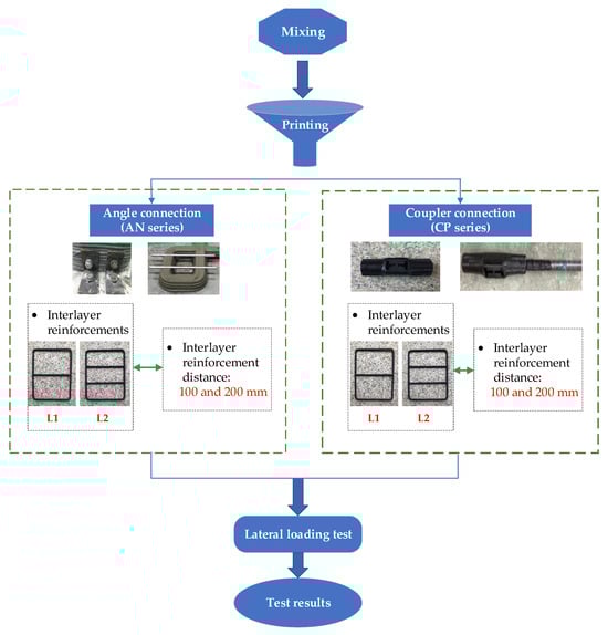 An experimental flowchart is presented in Figure 2. The mixture was prepared as mentioned in the previous section. Then, column specimens were printed by the gantry system. Steel angles were applied to some column specimens (AN column series), and couplers were used for the other column specimens (CP column series) to connect the column specimens to the foundation. During the printing process, two types of lateral reinforcement with two different spacings were attached to the printed layers to improve the bonding and shear strength of the column.