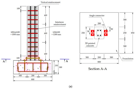Although the 3D printing technique has been widely applied, a method to connect printed structures and foundations has rarely been the focus of previous studies. Most of the printed structures were laminated as masonry with double walls and laid on even footings. Then, the joint between the masonry and foundation is filled with grout. Using this process, the printed structures can be temporally fitted to the footing, but it is considered that the structures are weak under lateral loads. In addition, the printed structure and foundation can be connected using the existing rebar fabricated with the footing [,]. While this connecting method can seemingly combine the structure and foundation, the existing rebars can preclude the use of a printing process, or a particular nozzle may be needed. A discontinuous printing process can affect the designed shape of the structure or generate cold joints at the interface of the printed layers []. In addition, preinstalled reinforcement for the printed structure limits the geometric freedom of 3D printing [].