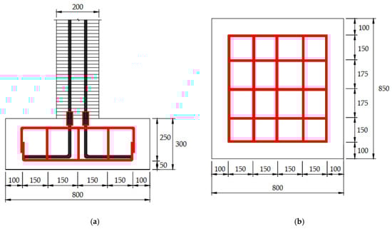The details of the foundation are presented in Figure 4. The foundation has dimensions of 800 × 850 × 300 mm. The foundation was reinforced by grid rebar with a spacing of 150 mm.