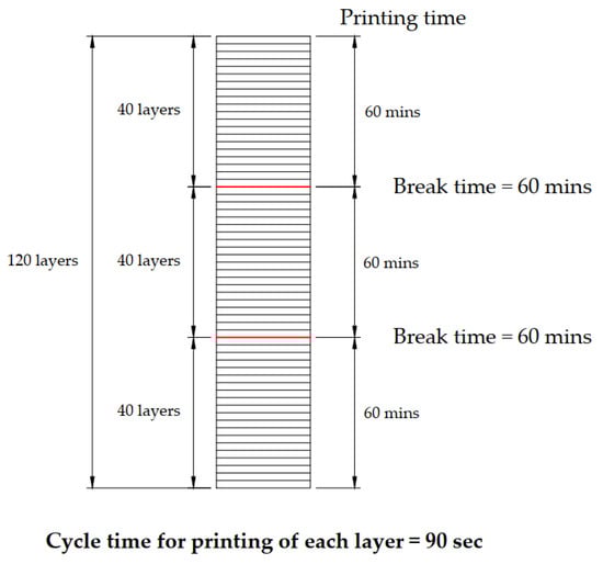 The time scenario for the printing process is presented in Figure 6. There are two large structures (each structure includes four target structures) printed in this study. These two structures were printed alternately during the printing process. Per printing cycle, 40 layers of each structure were printed within 60 min. Therefore, the break time for each printing cycle was 60 min after 40 layers of the structures were printed. Figure 7 shows the printing process of the second structure after 40 layers of the first structure were printed.