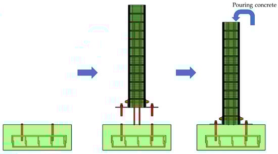 For the AN column series, as shown in Figure 8, the foundation was fabricated with four holes for installing the screw bolts connecting the column and foundation. Then, the column was located at the positions of the bolt holes, and the bolts were screwed into the holes. Finally, four vertical rebars were located in the hollow of the column, and concrete was poured into this hole.
