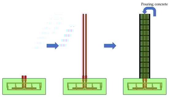 For the CP column series, the fabrication process is shown in Figure 9. Four rebars with a bend of 90 degrees at the end of the rebar were located in the foundation. The opposite ends of these rebars were connected to the rebar in the column with couplers. Finally, the column was placed over the foundation, and concrete was poured into this hollow column.