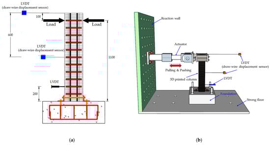 The test setup for the printed structures is provided in Figure 10. A horizontal load was applied to the printed structures near the top of the structure at a distance of 100 mm. To obtain the displacement of the tested structure, three linear variable differential transformers (LVDTs) were placed horizontally on the side face of the structures. One wire LVDT was placed at the top of the structure, and the other was placed at the middle at a distance of 600 mm from the top. The third LVDT was set close to the footing at a distance of 200 mm. An illustration of the lateral loading test is shown in Figure 10b. Four high-strength ground anchors were used to fix the column onto the strong floor of the laboratory, with the loading stub being subjected to lateral loading. The lateral test as implemented is shown in Figure 11.