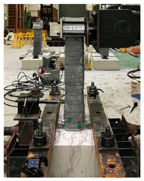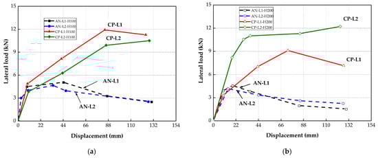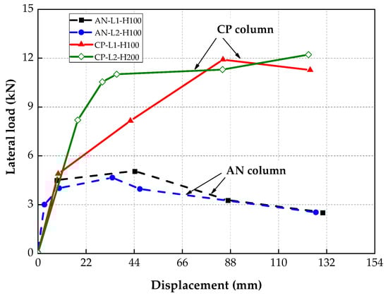 The load-displacement envelope curves of the AN and CP column series at various positions of columns are shown in Figure 16b. The load-displacement envelope curves were obtained by connecting the peak points in the hysteresis curve at each cycle. For the AN-L1-H100 column, the column reached the maximum load at the first loading cycle. This result indicates that the reduction in load after reaching the maximum load resulted from the deformation of the steel angles and the slippage of the column during loading. The column was connected to the foundation by steel angles; thus, the core rebar could not add strength to the column during the test.