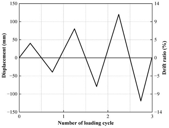 The cycling load of the lateral loading test is shown in Table 3 and Figure 12. Three drift ratios of 3.64%, 7.73%, and 10.91% were studied, which corresponded to displacements of 40, 80, and 120 mm, respectively. For each drift ratio, one load cycle was performed.
