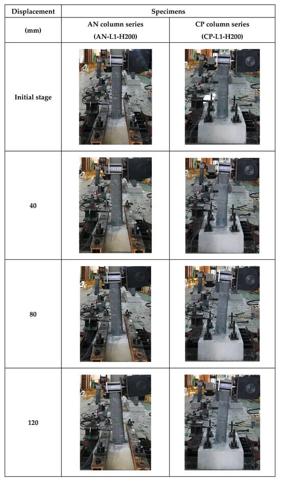 At the last drift ratio of 10.91%, although an increasing amount of dissipated energy was observed in the AN column series, this dissipation was not significant. The dissipated energy from the AN column series increased by approximately 20% at the last drift ratio. Meanwhile, a more significant amount of dissipated energy was obtained in the CP column series. For the CP column series, the dissipated energy increased approximately 1.5 times at the last loading cycle. The data indicate that the core rebars in the CP column series were well connected to the foundation; thus, the core rebars carried the lateral load during the test. Therefore, a large amount of dissipated energy was absorbed in the two-column series. Simultaneously, the AN columns were connected to the foundation by the steel angles; thus, the columns could slip, and the steel angles were deformed under the lateral load. Therefore, less dissipated energy was absorbed in this column series.