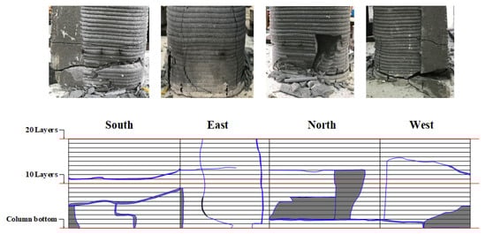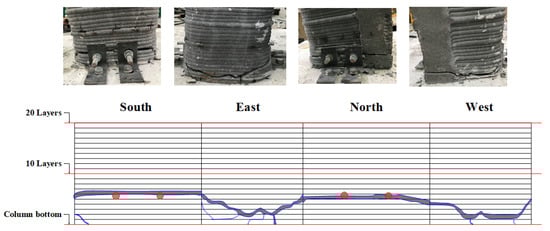 The typical failure pattern and cracking localization of the AN column specimen are shown in Figure 14. This failure reveals that the failure of the printed structure was accompanied by separation at the position of the connecting bolts (layer 5th). These cracks propagated from the southern face to the western face of the printed structure.