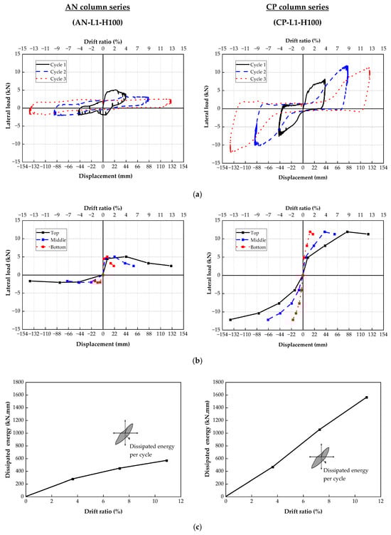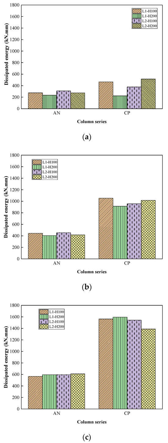 The dissipated energy at different drift ratios of the column is presented in Figure 16c. The energy dissipation capacity, which represents the ability of a structural component to consume lateral loading energy via plastic deformation under lateral loading, was determined. The amount of energy dissipated per cycle of loading was calculated by measuring the area enclosed by the hysteresis loop at a designated displacement level. This shows that the dissipated energy of the AN-L1-H100 and CP-L1-H100 columns tended to increase at further drift ratios. The dissipated energies of the AN-L1-H100 column at drift ratios of 3.64%, 7.27%, and 10.91% were 276.36 kN-mm, 444.47 kN-mm, and 567.23 kN-mm, respectively. Meanwhile, higher values of dissipated energy were obtained in the CP-L1-H100 column. The dissipated energies of the CP-L1-H100 column at drift ratios of 3.64%, 7.27%, and 10.91% were 465.44 kN-mm, 1054.72 kN-mm, and 1562.55 kN-mm, respectively.