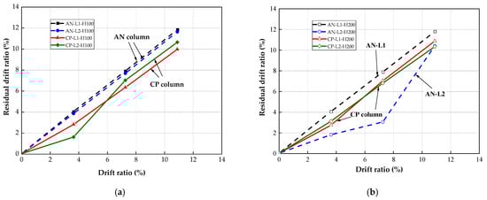 The main test results of the columns under lateral loading are shown in Table 4. Figure 16 shows the typical lateral response of the AN column and CP column series. The residual drift ratio was calculated as the ratio of residual displacement to the shear span of the column of 1100 mm. The AN-L1-H100 column achieved a peak load of 5.04 kN in the first loading cycle at a residual drift ratio of 2.1%. Then, the load capacity of the column tended to decrease. When the drift ratio reached 3.64%, the load of the column was 4.15 kN. For the second loading cycle, the load of the column was reduced. The peak load for the second loading cycle was 3.25 kN when the column achieved a residual drift ratio of 5.66%. At a drift ratio of 7.27%, the load of the column was 3.09 kN. For the third loading cycle, the peak load of the column was 2.50 kN, corresponding to a residual drift ratio of 11.08%. At a drift ratio of 10.91%, the load of the column was 2.47 kN.