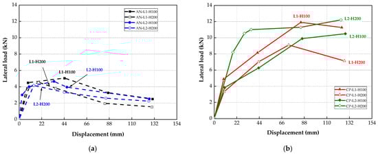 A comparison of the load-displacement curves between the columns with L1 and L2 reinforcement is shown in Figure 19. As shown in Figure 19a, for the columns with a lateral distance of 100 mm, the load capacity of the AN-L2-H100 column was insignificantly higher than that of the AN-L1-H100 column. Additionally, the load capacity of the CP-L1-H100 column was greater than that of the CP-L2-H100 column. For the H200 column series, the AN-L1-H200 column exhibited a greater load capacity than the AN-L2-H200 column.