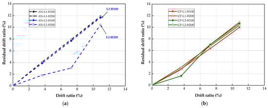 Figure 22 shows the influence of the lateral reinforcement distance on the residual drift ratio of the 3D-printed column. For the AN column series, the drift ratio curves of the AN-L1-H100 and AN-L1-H200 columns were similar at various drift ratio levels. The drift ratio curves of the AN-L1-H100 and AN-L1-H200 columns at a drift ratio of 10.91% were 11.85% and 11.79%, respectively. Meanwhile, the drift ratio curve of the AN-L2-H200 column was less than that of the AN-L2-H100 column at the various drift ratio levels. At a drift ratio of 10.91%, the residual drift ratio of the AN-L2-H200 column was 11.82% less than that of the AN-L2-H100 column.