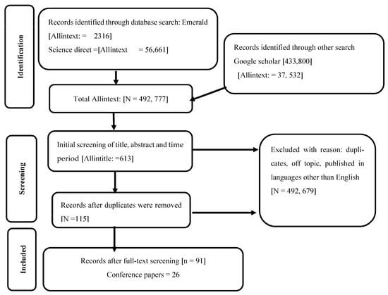 As shown in Figure 1, this study search focused on online published materials (such as research articles and book chapters). The databases used in this study include Emerald, Science Direct and Google Scholar publishers. Most of the previous reviews used these databases [,], which is an indication that these could be trusted databases.