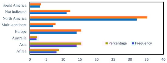 Figure 3 and Table 1 show the analysis of the articles by region (continent and country). The results show that most of the papers were published in North America (35.2%) followed by Europe and Asia with 14 (15.4%) documents each. A significant number of papers came from Africa (8.8%) while the lowest number were published in Australia (2.2%). About 12.1% of the articles published did not indicate the region where they were published while 7.7% of the papers cut across different continents.