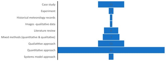 Mixed methods had seven papers, and this was followed closely by the literature review approach which had six documents. The experiment and systems model approach had two documents each while historical meteorology records and images—qualitative data approaches—registered one document each.