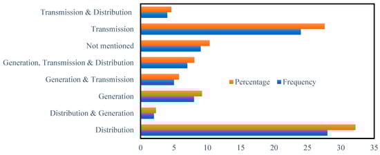 The electric grid is made up of three subsystems: generation, transmission and distribution. There are numerous studies that have been conducted on either generation, transmission, distribution, or any two of them or even all three of them. Regarding the subsystems of the grid, the study findings indicated in Figure 5 revealed as follows: most of the studies (28) studied only distribution, 24 studies looked at only transmission while only 88 studies looked at the generation subsystem. Transmission and distribution, distribution and generation and generation and transmission attracted four, two and five studies, respectively. A significant number of studies (seven) studied all the three subsystems of the grid while (nine) studies did not hinge their investigation on any subsystem. This study highlights that the generation subsystem of the grid has been researched the least and yet problems still prevail in the generation part of the grid. This calls for further research in the generation subsystem of the grid.