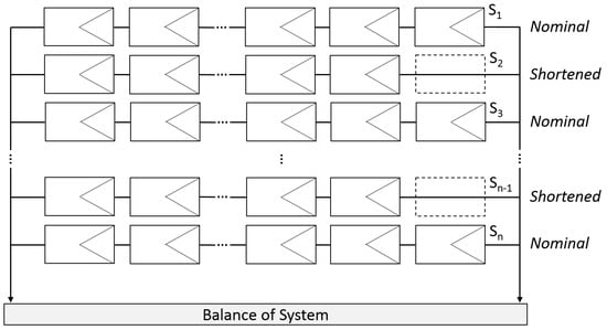 To comprehend these phenomena, simulations were executed involving the selective disconnection of a subset of modules within the test string, denoted as , effecting the electrical bypass of modules to reduce its module count. This deliberate reduction aimed to induce mismatch conditions between the nominal and test strings. The range of manipulations involved the removal of between zero and five modules from over the course of the investigation. Strings conforming to the standard module count are designated as ‘nominal’, while those exhibiting mismatched lengths are labeled as ‘x-module shortened’, with x representing the variance in module count between the nominal and test strings. A visual representation of 1-module shortened strings within an array of n paralleled strings is depicted in Figure 1.