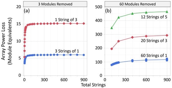Array power loss in module equivalents at 800 W/m2 and 50 C for reductions in array size of (a) 3 modules and (b) 60 modules using several string-shortening variations. More extreme levels of shortening for equivalent module removal results in higher relative power losses.