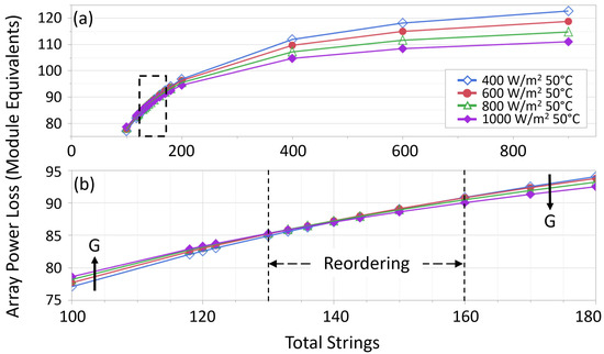 However, this relationship reverses when arrays have a low total number of strings, and hence a higher proportion of shortened strings within the array. A section of Figure 3a is expanded into Figure 3b. Above 160 total strings, the impact on array power is as described with the range increasing as array size increases. Below 130 total strings, the relationship is reversed such that power loss increases with increasing irradiance. The power loss range between low and high irradiance conditions is more substantial with small arrays and narrows with increasing array size. Between 130 and 160 total strings, the relationship is not as easily described. Within this region, the power loss range is at a minimum and the irradiance-specific curves shift relative to one another.