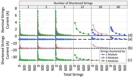 In an open-circuited array, shortened strings exhibit a reverse current (lower half of figure), sourced from nominal strings (upper half of figure). Simulations conducted at 800 W/m2 and 50 C with varying degrees of string shortening reveal that the reverse current tends to stabilize, reaching a limit determined by the level of mismatch, rather than the number of shortened strings. Specifically: (a) single-module shortened strings self-limit to approximately 4.8 A, (b) three-module shortened strings self-limit to approximately 17.7 A, and (c) five-module shortened strings self-limit to approximately 35 A. As depicted in (d), with an increase in the total number of strings, the contribution of nominal strings to the overall current diminishes to very low levels.