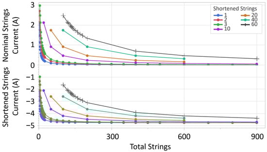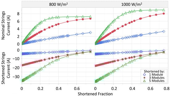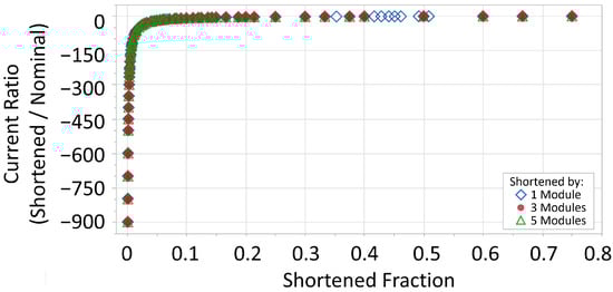At an open circuit, the current generated by the nominal string(s) and the reverse current dissipated by the shortened string(s) are in balance only when the number of shortened strings equals the number of nominal strings, a shortened to nominal current ratio of −1.0. The value is negative since the shortened string current is of the opposite sign to that of the nominal string. When analyzing the shortened to nominal current ratio as a function of the shortened fraction, a single behavior is observed as shown in Figure 7. All simulations at all irradiances collapse along a single curve, which passes through a ratio of −1.0 when the shortened fraction is 0.5. Equation (1) is derived from this behavior and calculates the shortened string reverse current given the configuration of the array and the nominal string current; in this equation, I is the reverse current flowing into the shortened string(s), I is the current flowing in nominal strings, n is the total number of strings, and, n is the number of shortened strings.