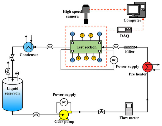 Figure 1 shows the schematic of the experimental flow loop system. All components of the entire setup are connected using stainless steel pipes, forming a closed-loop system. Deionized water flows out of the liquid reservoir and is then pumped into a flow meter by a gear pump before entering the preheater. The preheater is responsible for heating the deionized water to the desired temperature for experimental purposes. After passing through the preheater, the deionized water enters the testing section. The temperature and pressure of the fluid at the inlet and outlet of the test section are monitored using two K-type thermocouples and two pressure transducers (Yokogawa EJA530E, Musashino, Tokyo). The heating power of the cartridge heaters in the testing section is controlled by a DC power supply unit (ITECH IT6513A, New Taipei City, Taiwan), and the heating temperature is monitored by 15 T-type thermocouples, which are distributed across three layers. The K-type thermocouples used in this experiment were manufactured by OMEGA (model: TJ36-CPSS-316, Dublin, Ireland), with an exterior diameter of 4.78 mm. The T-type thermocouples, also manufactured by OMEGA (model: TMTSS-032), had an exterior diameter of 0.8 mm. All measurement instruments were calibrated before the experiment. The fluid flows back to the liquid reservoir after passing through the condenser.