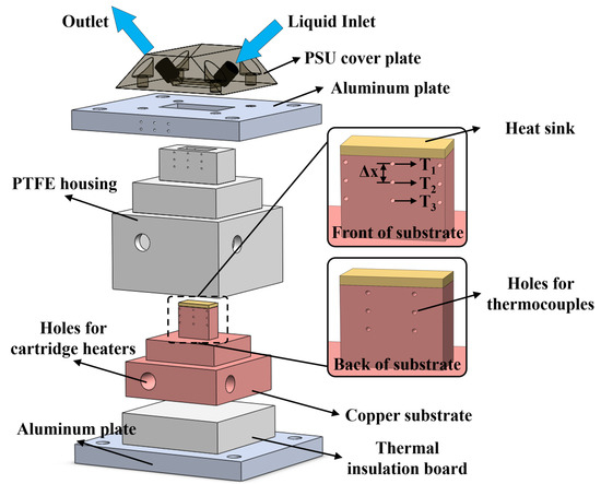 Figure 2 illustrates the decomposition diagram of the test section and presents a schematic representation of the heat sink in the present study. The test section comprises seven main components: a cover plate, an upper aluminum plate, a polytetrafluoroethylene (PTFE) housing, a copper substrate with a heat sink, a heat-resistant insulation board, and a lower aluminum plate. The cover plate is made of polysulfone and secured to the upper aluminum plate using bolts. The cover plate is designed with liquid inlet and outlet ports and spaces for liquid flow. Fifteen holes are distributed on both the PTFE housing and the copper substrate to accommodate the insertion of thermocouples. The copper substrate is made of oxygen-free copper and connected to the micro heat sink through welding. Additionally, the copper substrate has four holes for inserting cartridge heaters. The copper substrate is completely enveloped by the PTFE housing and the bottom insulation board, reducing heat dissipation. The lower aluminum plate supports the entire structure and is securely fixed to the upper aluminum plate using bolts.