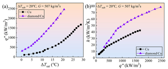 Heat transfer performance comparison between diamond/Cu and Cu heat sinks: (a) boiling curves; (b) heat transfer coefficient curves.