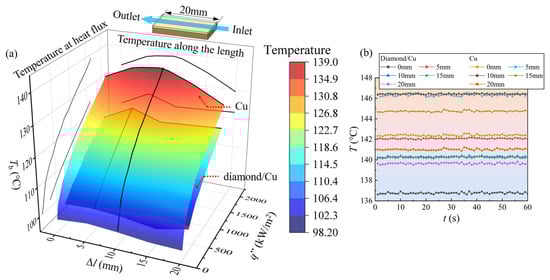 Another important indicator for evaluating heat sinks is their temperature distribution. The temperature uniformity can represent the stability and consistency of the heat sink operation and the heat transfer capability. The aim of this experiment was to study the thermal uniformity performance of the heat sink by calculating the temperature distribution at the bottom. Figure 5a illustrates the bottom temperature distribution along the length direction of the heat sink under different heat fluxes. The x-axis represents the temperature measurement positions. The total length of the heat sink is 20 mm, and thermocouples are placed at the following positions: 0, 5, 10, 15, and 20 mm. The y-axis represents the heat flux, while the z-axis represents the temperature at the bottom of the heat sink. The peak and overall temperatures of the Cu heat sink were consistently higher than those of the diamond/Cu heat sink, indicating that the diamond/Cu heat sink can maintain lower temperatures than the Cu heat sink across all points under the same heat flux. At a low heat flux, the temperatures of both heat sinks at all positions are similar. On one hand, the temperature at the middle section (10 mm) of the Cu heat sink rises with the heat flux, leading to an increasing temperature difference between the middle section and the two ends. On the other hand, except for the highest temperature at the 5 mm position, the temperature differences at the other four positions of the diamond/Cu heat sink are relatively small. Figure 5b illustrates the temperature--time curve of the uppermost thermocouples at different positions under high heat flux (q″ = 1610.75 kW/m2). It can be observed that, under the fixed operating conditions, the temperature variation of the thermocouple is minimal, with a fluctuation difference not exceeding 0.6 °C.This indicates that the temperature data are reliable. The diamond/Cu heat sink exhibits superior performance in terms of temperature uniformity compared with the Cu heat sink. To further quantify the temperature difference and temperature fluctuation amplitude σ between the two types of heat sinks, Figure 6 shows the temperature difference (ΔT) between the highest and lowest temperatures at the bottom of the heat sink and the overall temperature fluctuation amplitude (σ) under different heat fluxes. The ΔT of the Cu heat sink was consistently greater than that of the diamond/Cu heat sink. At q″ ≈ 1600 kW/m2, the ΔT of the diamond/Cu heat sink was 29% lower than that of the Cu heat sink. Additionally, the σ of the diamond/Cu heat sink decreased by 39% compared with that of the Cu heat sink. The above findings indicate that diamond/Cu composite, as a heat sink material, could quickly spread the localized heat load, thereby providing efficient and stable heat dissipation.