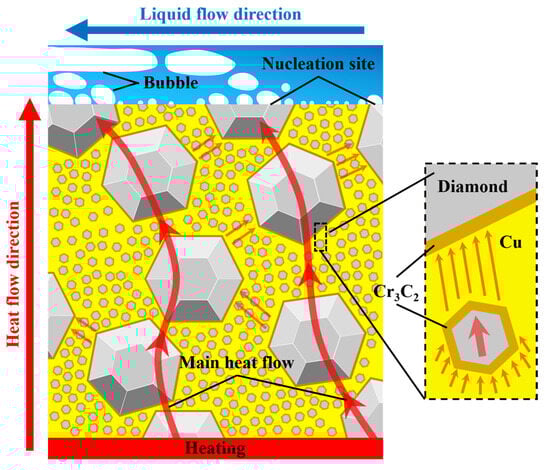 The experiment utilized diamond particles of different sizes to construct a complex heat conduction network. Cu-Cr alloy was used as the matrix, and Cr was used as the interface control. Under high-temperature preparation conditions, the C element on the surface of the diamond combined with the Cr element in the matrix, leading to the formation of a Cr3C2 interface layer. The internal microstructure of the diamond/Cu composite is shown in Figure 7. The directionality of heat conduction is influenced by the thermal conductivity and the pathways of heat transfer. The uniformly distributed secondary diamond particles fill the gaps between the main diamond particles. The primary heat flow passes through a main diamond and subsequently enters the next main diamond through a heat-conducting channel constructed by secondary diamonds. The secondary diamonds fill the thermal path gap between the main diamonds, reducing the length of the heat conduction path. Furthermore, diamonds have a high thermal conductivity. These factors contribute to the formation of a three-dimensional heat conduction network characteristic within the diamond/Cu composite. The network of extensive heat within this three-dimensional heat conduction network results in a higher heat flux of the exposed diamond particles on the heat sink surface. This enables faster transfer of heat to the heat-exchange surface, accelerating the occurrence of nucleation sites. The surface non-uniformity of diamond/Cu results in difficulties for the growth of bubbles to a large size. Additionally, the surface roughness is significant, leading to the presence of numerous nucleation sites. As depicted in Figure 8, under the same experimental conditions, the diamond/Cu heat sink exhibits more nucleation sites on its heat transfer surface than the Cu heat sink. During the nucleate boiling process, small bubbles tend to grow rapidly on the diamond surface and depart from the surface more frequently, detaching quickly from the surface. This facilitates the prompt, continuous, and stable phase transition of the liquid on the heat transfer surface, harnessing bubbles to carry away a substantial amount of heat. Consequently, it leads to a reduction in the wall temperature and the maintenance of a favorable level of uniformity. The unique network structure and non-uniform surface of the diamond/Cu composite contribute to the exceptional flow boiling heat transfer characteristics of the heat sink.