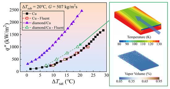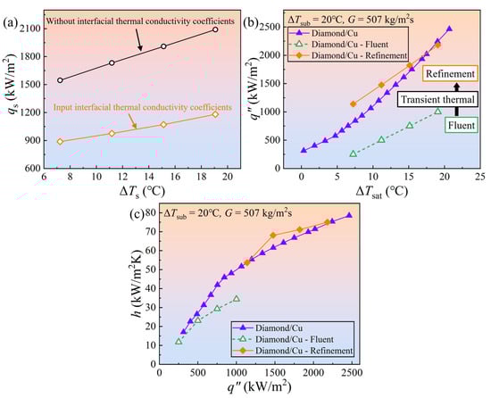 where n represents the number of temperature thermocouple columns being monitored, totaling five columns. qS,n represents the stationary heat flux in the z-axis direction in the transient thermal model. Vm is the model volume, and V represents the volume of the heat sink. To closely match the experimental conditions, the temperature boundary condition ΔTs in the transient model is set to be consistent with the experimentally obtained value of ΔTsat. When the interfacial thermal conductivity coefficients are not input, the transient heat transfer model will consider all interfaces as perfect interfaces with 0 thermal resistance. As a result, the obtained result is significantly higher than the actual values, as shown in Figure 12a. The heat flux associated with the input interfacial thermal conductivity coefficients is added to the heat flux in the Fluent model. The modified boiling and heat transfer coefficient curves are shown in Figure 12b,c. At the same wall superheat, the introduction of the heat conduction network significantly increased the heat flux in the diamond/Cu composite. The modified boiling and heat transfer coefficient curves after the refinement closely resemble the experimental data. The coupling of the Fluent and interface-assisted thermal models formed a new model that can accurately simulate the flow boiling heat transfer performance of the diamond/Cu heat sink. The modified model provided evidences for the enhanced impact of the diamond network on the flow boiling performance of diamond/Cu heat sinks.