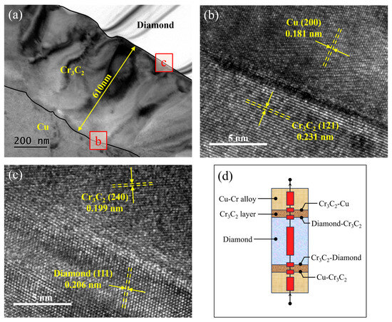 Microstructure of the interfaces: (a) Transmission electron image of the layer between Cu and diamond; (b,c) high-resolution transmission electron micrograph; (d) schematic of heat transfer paths in the diamond/Cu.
