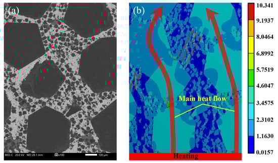 The interface layer is approximately 610 nm thick, continuous, and uniformly thick. Despite the significant difference in CLTEs between the materials, no cracksor defects were observed in the interface, the diamond, or the copper matrix after they underwent temperature changes. This observation indicates the excellent bonding strength of the interface. Considering the uniformity and good bonding of the Cr3C2 interface layer, it can be regarded as an ideal interface [47]. By incorporating the interfacial thermal conductivity into the transient thermal simulation in ANSYS, a thermal conductivity model that is applicable to the diamond/Cu composite can be established. According to Table 3, the interfacial thermal conductivity facing the heating side on the diamond is 6.052 × 108 W/m2K, and the interfacial thermal conductivity facing the cooling side is 3.388 × 109 W/m2K. The temperature was set according to the temperature gradient within the material of the same dimensions in the experiment. The thermal conductivity at the interface between each diamond particle and the copper matrix was determined based on Table 3. By utilizing a graphical processing method [29], the real cross-section of the diamond/Cu composite was extracted, with a thickness equal to the diameter of the smallest diamond particles (30 μm). Through finite element analysis, the distribution of heat flux can be obtained. This distribution is shown in Figure 11. The functionality of the diamond heat conduction network was experimentally verified, with the main heat flux flowing through the main diamonds, while the secondary diamonds serve as connectors between the main diamonds. The heat flow tended to prioritize the shortest heat-conducting path along the cooling direction within the main diamond conduction channels.
