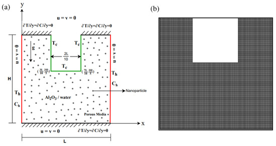 The lattice Boltzmann method (LBM) is a popular and powerful simulation technique to model complex flow patterns [2,14] numerically. The LBM considers the fluid density on a special lattice formation and develops the analysis through simulation with streaming and collision [15,16]. Among different relaxation variants, multiple-relaxation-time (MRT) is considered to be one of the most precise and positive options. The MRT-LBM option has been considered the most efficient for instability reduction. However, the selection of MRT-LBM combinations varies based on the geometric configuration, the types of transport phenomena, and the computational resources. While industries responsible for the thermal efficiency enhancement of thermo-mechanical devices will undoubtedly benefit from the inclusion of nanoparticles, certain issues require consideration. One is the need to impose control on the augmented heat transfer rate. Thermosolutal natural convection, heat, and mass transfer must be observed. Magnetohydrodynamics (MHD) is the study of fluid flow and electrically conducting fluid in a heat transfer process and is a strong candidate to serve as the controller [17]. A strong magnetic field works against the heat transfer process and could be used as a restriction if a heat transfer process needs to be stable to a certain extent. However, further analyses are required to investigate the effect of using LBM-MRT-MHD techniques on thermosolutal natural convection where both Dufour and Soret effects exist. Nevertheless, the proper geometry that can represent a certain heat and mass transfer unit needs to be selected.