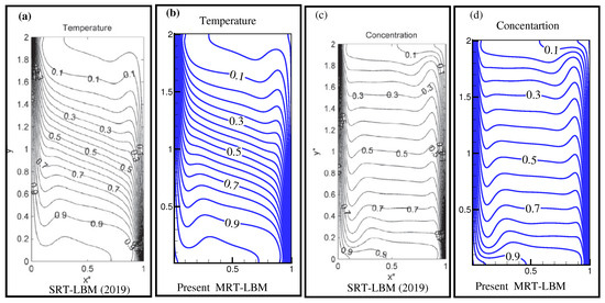 A qualitative comparison is shown in Figure 2 for the Soret and Dufour effects in terms of the isotherms and the isoconcentration lines obtained by Ren and Chan [37] using the single-relaxation-time (SRT) LBM while , , , , , , , and . By inspection, this qualitative comparison also confirmed the code validation.