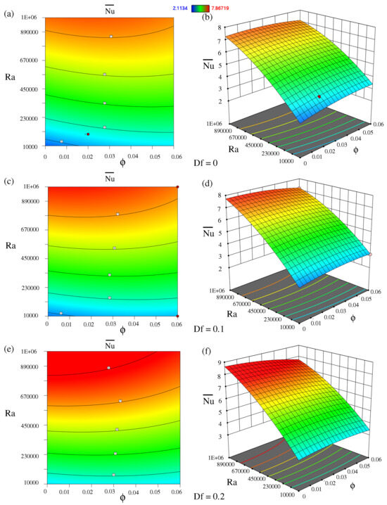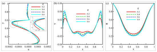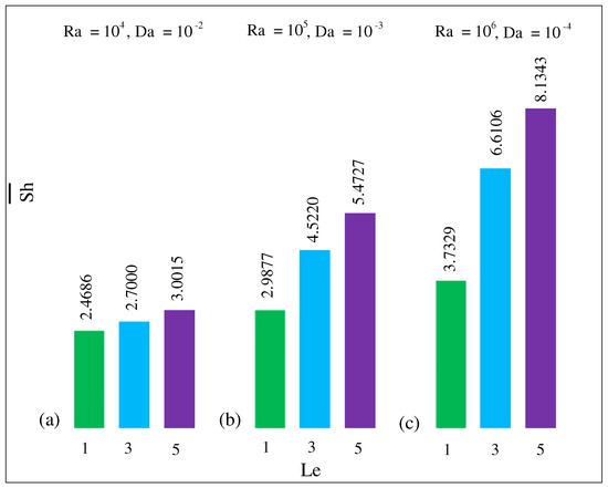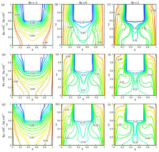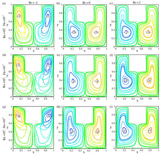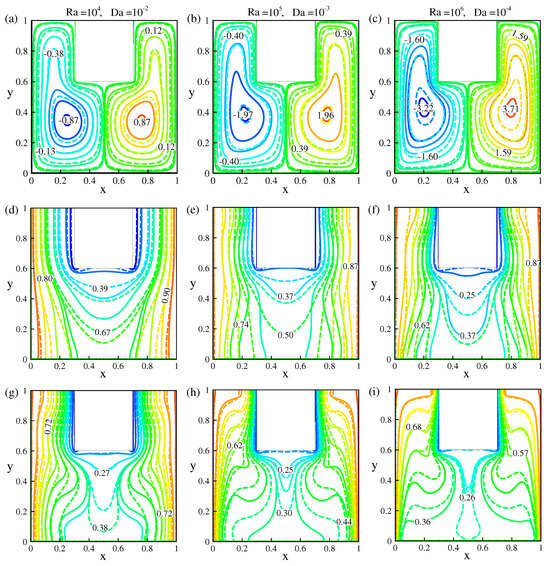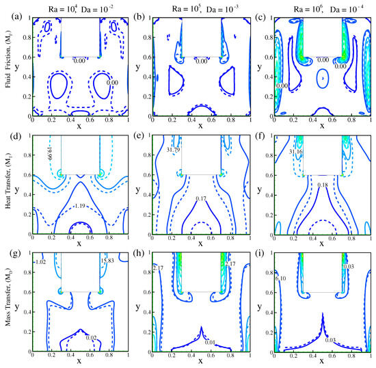 Figure 3 represents the isotherms, streamlines, and isoconcentrations for various numbers and numbers at , , , = , and = (solid line), (long-dashed line). The fluid responded by passing through the heated wall first, then the cold wall, moving upward and lower. For = , , and , two vortexes were created on the left and heated right sides of the enclosure. The velocity changes across the vertical walls were greater than in the core zone of the left vortex, resulting in dense streamlines. Nevertheless, the concentrations were comparatively lower along the steep walls than in the middle area of the right vortex. The configurations of the streamlines and the isotherms were organized and distributed equally in all circumstances. The dimensions of the vortex grew rapidly as the numbers increased. The buoyancy effect caused the flow to circulate at the center of the enclosure and to descend along each side wall, creating mirror-image structures that revolved in the right and left half counter-clockwise. Both cells presented elliptical shapes. The symmetry ensured that the flows in the enclosure’s left and right halves were identical. As the fluid permeability across a cross-sectional area decreased, reduction in the number resulted in less buoyancy-induced flow, progressively thickening the boundary layer. The heat transfer decreased slightly as the number increased and the Darcy number decreased. The transfer of mass changed as shown in Figure 3g–i. A higher number and a lower number resulted in a synergistic rise in the mass exchange rate. The lower Darcy number complemented the higher flow velocity and convective transport generated by the higher number to produce a much more effective mass transfer process in the fluid.