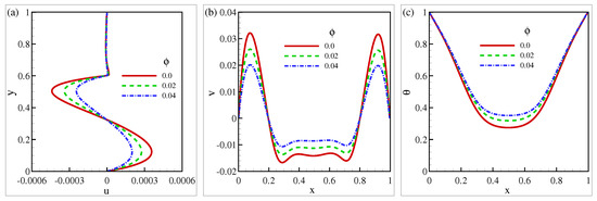where u and v denote the nanofluid’s non-dimensional velocity along the x and y’s non-dimensional directions. The dimensionless forms of the temperature, time, solutal concentration, and pressure are denoted by the symbols , t, , and p, respectively. is the kinematic viscosity, D is the mass diffusivity, and is the thermal diffusivity of the base fluid. is the buoyancy ratio and the Rayleigh number is . The Prandtl number is , is the Lewis number, and K is the permeability of the porous medium.