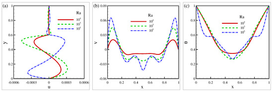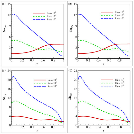 Table 5 shows another validation for the cross-diffusion with the results of Xu et al. [11] and Ren et al. [37] for the different Rayleigh numbers while , , , , , and . Here, the computational domain was a side-heated vertical cavity with an aspect ratio of , where the height is H and L is the width of the cavity. This table also ensures that the present LBM code was validated for the cross-diffusion with the Soret and Dufour effects.