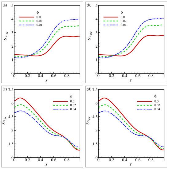 The consistency factor for the power-law model is . Here, the Newtonian pure fluid is represented by , and the Newtonian fluid viscosity is . The diameter of the base fluid molecule is given by , the nanoparticle size, nm, is uniform, and the shape is spherical.