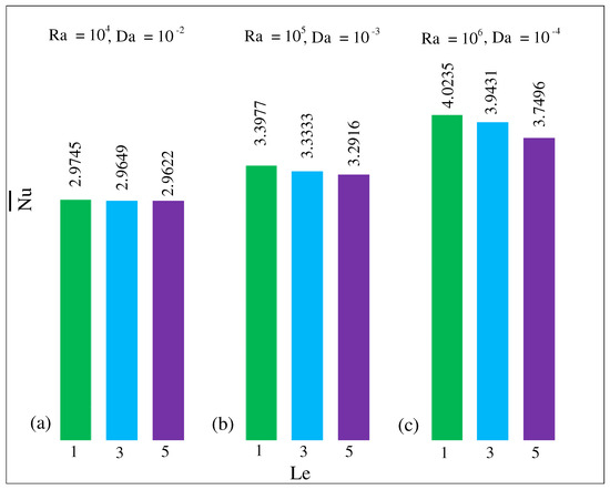 The MRT-LB Simulation was applied to simulate the cross-diffusion natural convection of a nanofluid in a porous U-shape enclosure. The parameters specified here are the Rayleigh number, ; the volume fraction of the nanoparticle, ; the buoyancy ratio, ; the Darcy number, ; the Dufour number, ; the Soret number, ; and the Prandtl number, = . In the velocity and temperature distribution, we vary the porosity, = to . The variant of the Lewis number, = 1 to 5, is also shown in and as a bar chart.