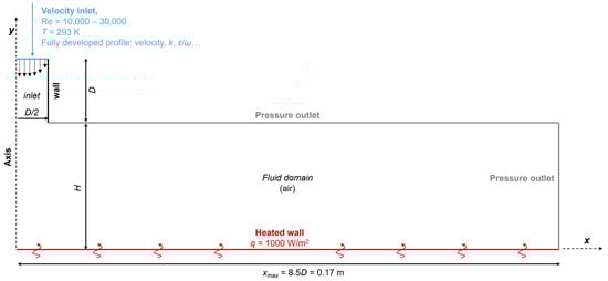 For all analyzed cases presented in this article, the inlet part length was equal to one inlet diameter D, and because of the use of a fully developed profile at the inlet, it was unnecessary to extend it. The maximum length (xmax) was set to 8.5D to avoid the influence of the outlet boundary condition on the heat transfer processes occurring near the impingement region. Other researchers [17] claimed that the value of at least 6D is sufficient for this kind of analysis. Preliminary analysis and some studies were performed for geometries with an inlet diameter equal to 0.01 m and others, including the main calculations for a geometry with an inlet diameter equal to 0.02 m. Inlet length, inlet diameter, and domain length were fixed for all four geometrical configurations defined by a dimensionless ratio of domain height H to inlet diameter (H/D = 1, 2, 4, 6). The only dimension changing was the domain height, representing the distance between the inlet and the impinging surface.