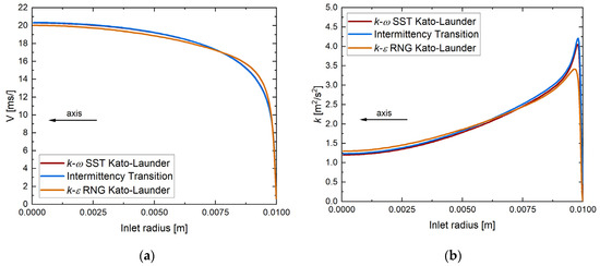 The applied boundary conditions kept for all analyses are presented in Figure 1. Air entered the computational domain with a constant temperature of 293 K. At all Reynolds numbers considered (10,000, 20,000, 23,000, 30,000), a fully developed profile of velocity and other turbulence parameters, i.e., k, ε/ω, etc., was implemented. They were calculated in a separate model (pipe with periodic boundary condition). A comparison between fully developed inlet profiles is presented in Figure 2. The radial velocity component is almost zero (~10−10 m/s), so the magnitude of the velocity was equal to its axial component.