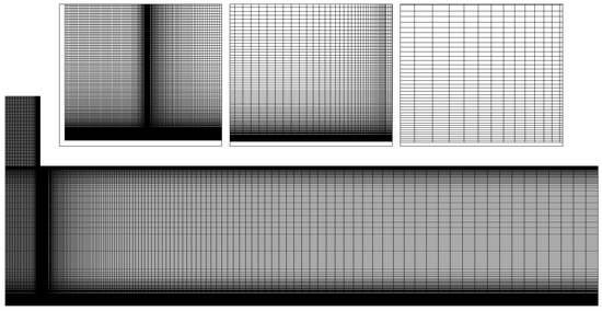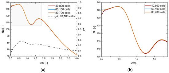 Four block-structured system discretizations of each H/D ratio value (=1, 2, 4, 6) were created. The total element number was between 46,060 and 80,100 at H/D = 1 and H/D = 6, respectively. The inflation layer was applied to all the walls in the model, and the value of y+ was approximately 1 (at the highest Reynolds number value). The exemplary discretization is presented in Figure 3. The local Nusselt number distribution at the heated wall was the most important parameter, so it was selected for the mesh sensitivity study. Figure 4 compares the local Nusselt number distribution at the heated wall for three different meshes and its close-up near stagnation region. The study showed two things: first, the selected mesh (63,100 cells) has passed the grid independence test; second, the local Nusselt number distribution near the stagnation point is sensitive to discretization in that region, which was visible on the coarse grid. Therefore, grid generation in that place must be performed carefully. The mesh sensitivity study was conducted similarly for all other cases and investigations. The grid details are available in the Supplementary File.