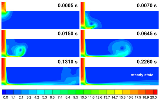 The authors did not find in the literature any explicit justification for why steady-state calculations are suitable for such cases. Therefore, the transient (with timestep equal to 10−4 s, maximum CFL number equal to 1) and steady-state analysis were performed. It was found that there is no difference between the steady-state and transient models. Figure 5 shows snapshots of the unsteady velocity magnitude at various time steps.
