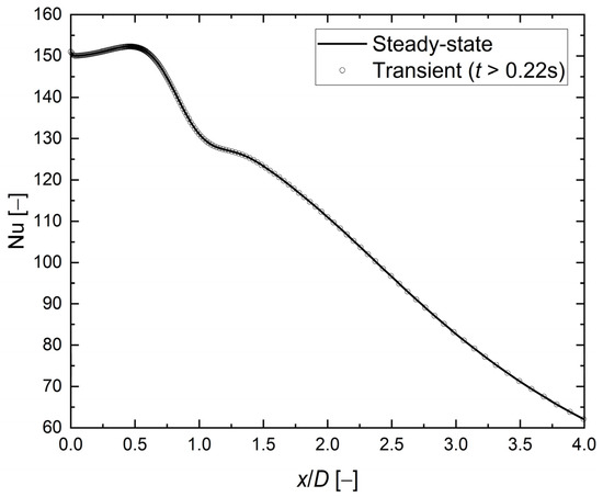 The propagation of a large vortex structure along the impingement surface is visible. The moment when the structure escapes the computational domain is almost the same time as when the steady state is reached—about 220 ms. Moreover, the same structure is visible during the steady-state calculations, and its development correlates with early oscillations visible on the residuals plot. Figure 6 compares the local Nusselt number values at the heated surface between steady-state and transient calculations. There is a negligible difference; therefore, the steady state approach was selected for further calculations of single turbulent jet impingement.