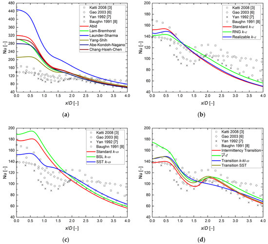 Comparison between preliminary numerical results and experimental studies [3,6,7,8]. The local Nusselt number distribution along the heated surface. H/D = 2, D = 0.01 m, Re = 23,000. (a) low-Re k-ε models; (b) k-ε models (enhanced wall treatment, without Kato–Launder limiter); (c) k-ω models (without Kato–Launder limiter); (d) other models.