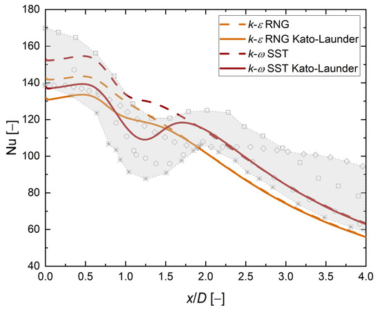 Influence of the Kato–Launder limiter on the local Nusselt number distribution. k-ε RNG and k-ω SST models, H/D = 2, D = 0.01 m, Re = 23,000. The shaded area represents the experimental results [3,6,7,8].