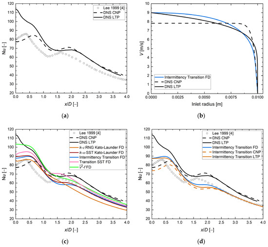 Fourth (Figure 9d), the last step in this study was to analyze the Intermittency Transition model with the same velocity inlet profiles as in the DNS study. According to DNS and RANS calculations, the Nusselt number distribution (for x/D < 2) is influenced by the inlet velocity profile. This finding is also corroborated by references [15,16]. The local Nusselt number distribution shape for CNP is similar to the DNS one, with a constant offset of ~5% for small values of x/D < 1. The most significant discrepancies (~22%) and different behavior of the Nusselt number can be found between x/D = 1 and x/D = 2.5. It was mentioned previously that the LTP does not represent a fully developed velocity profile. Minor differences (<2%) in the RANS Nusselt number distribution between LTP and FD profiles support that observation. Moreover, fully developed and flat inlet profiles limit the Nusselt number values, and all not-fully-developed profiles lay between them [15,47]. The enormous overprediction (35%) of the Nusselt number in the stagnation zone in DNS calculations is not supported by any RANS model calculations (except ) and experimental studies.