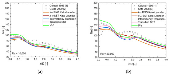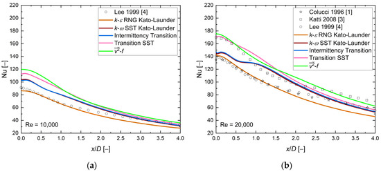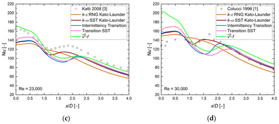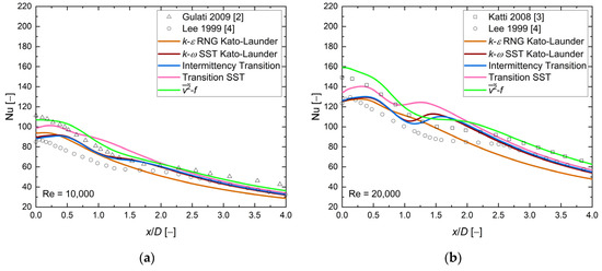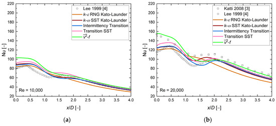 All experimental data showed a second Nusselt maximum in the region between x/D = 1.5 and x/D = 2.0. Analysis of the CFD results revealed that at Re = 20,000, 23,000, and 30,000, only the k-ω SST Kato–Launder turbulence model indicated local maxima in that region, while local minima of the Nusselt number characterized other models. At Re = 10,000, , Transition SST and k-ω SST Kato–Launder turbulence models demonstrated weak secondary maxima. Discrepancies in the Nusselt number stagnation point values (20–30%) could be observed for cases where two experimental data sets were available, and all numerical results laid between them, except the turbulence model. The k-ε RNG Kato–Launder and turbulence models were limiting the values of the Nusselt number, and the results obtained with were always higher than k-ε RNG Kato–Launder by ~23–34% and ~20–27% at x/D < 1 and x/D > 2.5, respectively. The shape of the model was very close to the experimental data [3] in stagnation region x/D < 1 and the far away region x/D > 2.5 with differences of ~5%. The region where failed was the second maxima, at x/D between 1.5 and 2.0.