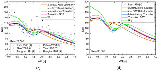 The local Nusselt number distribution, comparison between CFD RANS results and experimental data [3,4,5,6,7,8,9]. H/D = 2, D = 0.02, and (a) Re = 10,000, (b) Re = 20,000, (c) Re = 23,000, (d) Re = 30,000.